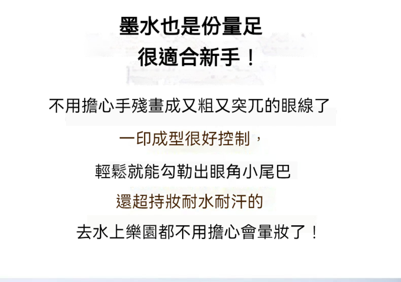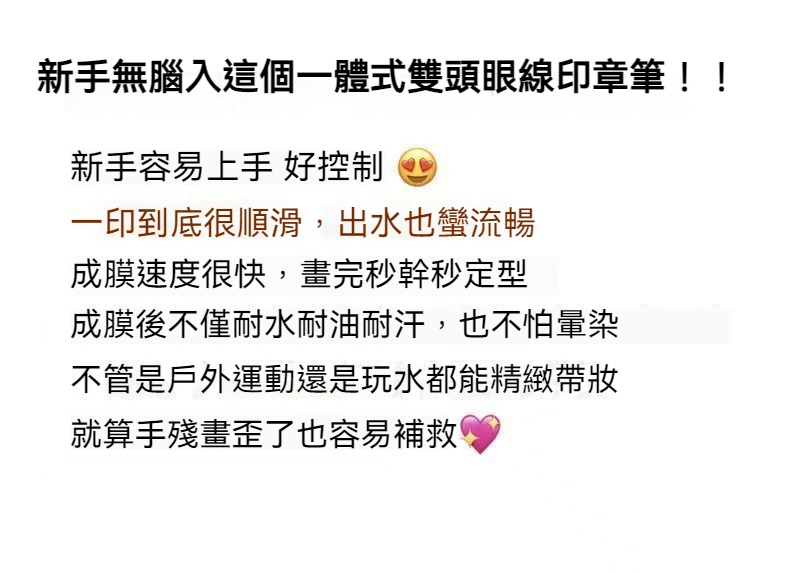 【新手也能畫出對稱眼綫,0失敗成本】一體成型雙頭眼線印章,輕輕一按,完美的眼綫就畫好了,含墨量相當於普通眼綫液的4倍!出液均匀、防水防汗持久不暈染!單眼皮也能輕鬆成功!